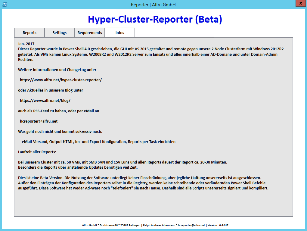 Am Setup arbeiten wir noch, aber ein paar Vorab-Informationen soll es bereits jetzt schon geben. Das Setup wird neben den Programmdateien und PS-Scripten in einem auszuwählenden Verzeichnis sowie unsere Stammzertifikate installieren, da alle Scripts unsererseits signiert sind, einen Desktop-Link anlegen und einen Registry-Pfad unter „HKLM\Software\Alfru GmbH“ zum Speichern der Optionen anlegen. Der HCReporter kann vollständig ohne Rückstände deinstalliert werden. Eine Veränderung an den Betriebssystem-Komponenten wird nicht vorgenommen werden. Grundsätzlich arbeitet der HCReporter nur im Lesemodus und verändert keine Rollen oder Features des Betriebssystems, außer und nur optional, wenn gewissen Powershell Module für die Ausführung fehlen, dann können diese über den Tab „Requirements“ nachgeladen werden. (Hyper-, ADDS- und Failover-Cmdlets).