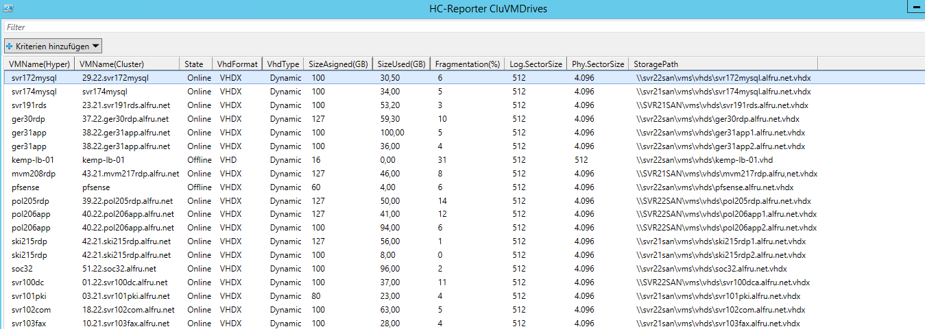 Aufstellung und Informationen zu den virtuellen Festplatten der einzelnen VMs, Größe, Fix oder Dynamische, derzeitigen Größen (Nutzung), Speicherorte